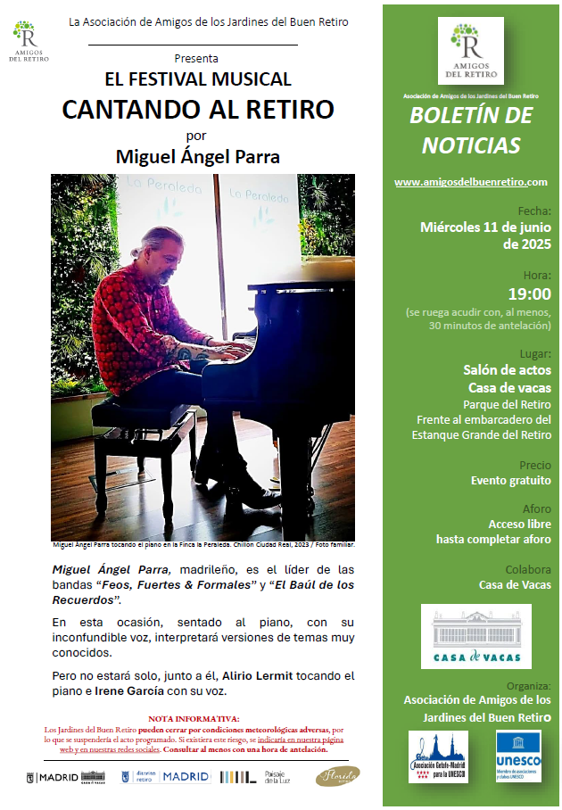 Los Jardines del Buen Retiro pueden cerrar por condiciones meteorológicas adversas, por lo que se suspendería el acto programado. Si existiera este riesgo, se indicaría en nuestra página web y en nuestras redes sociales. Consultar al menos con una hora de antelación