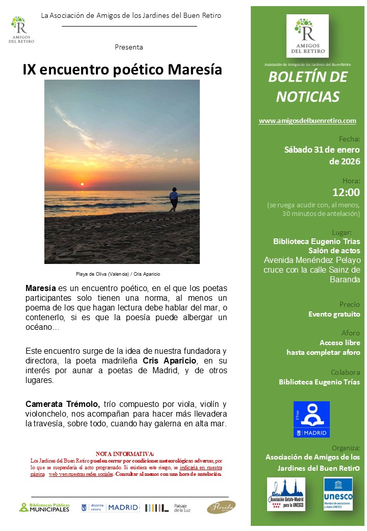 Los Jardines del Buen Retiro pueden cerrar por condiciones meteorológicas adversas, por lo que se suspendería el acto programado. Si existiera este riesgo, se indicaría en nuestra página web y en nuestras redes sociales. Consultar al menos con una hora de antelación