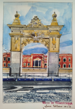 Arco de la Maestranza de Madrid (antiguos cuarteles de Daoiz y Velarde ). Acuarela de Gloria Velasco.